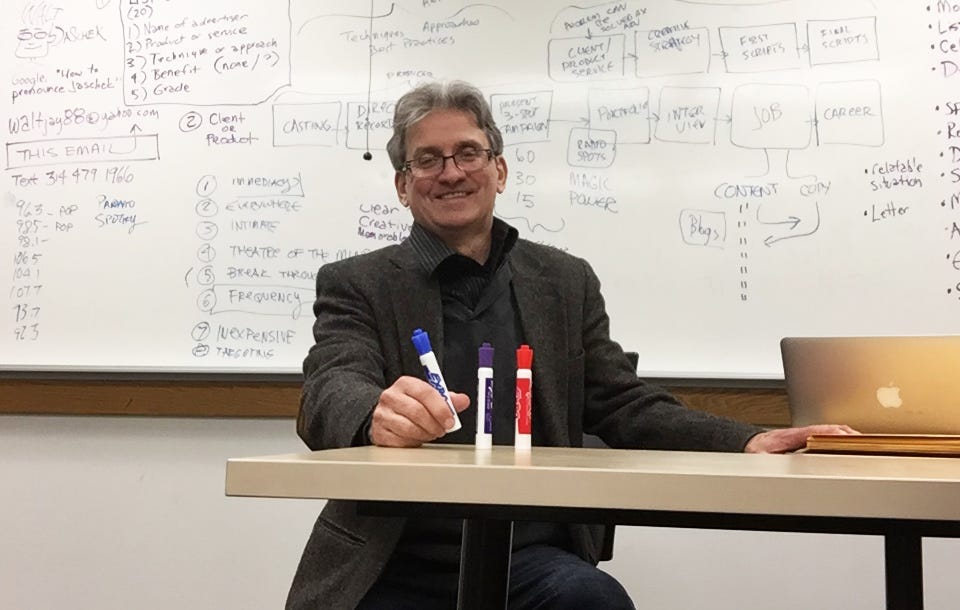 From 2000 to 2020, Walt served as a part-time adjunct instructor at Webster University in Webster Groves, Missouri, teaching marketing-focused classes in Creative Strategies, Copywriting and Radio Production. He served as a mentor to many of the ad students and sometimes connected them with their first jobs.